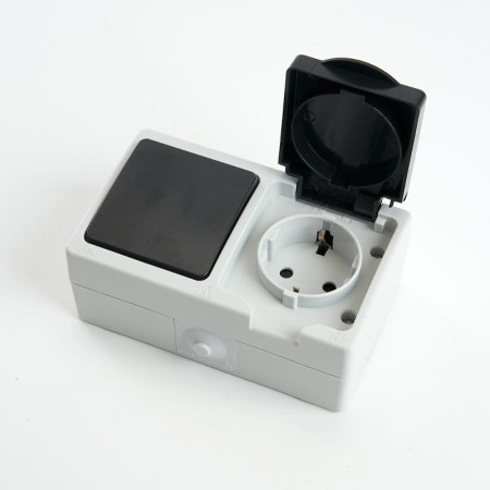 PST16-11-54/10-111-54 Блок: розетка 1-мест с/з, 250В, 16А+выключ 1-клав., 1-полюс, 250В, 10А, IP54