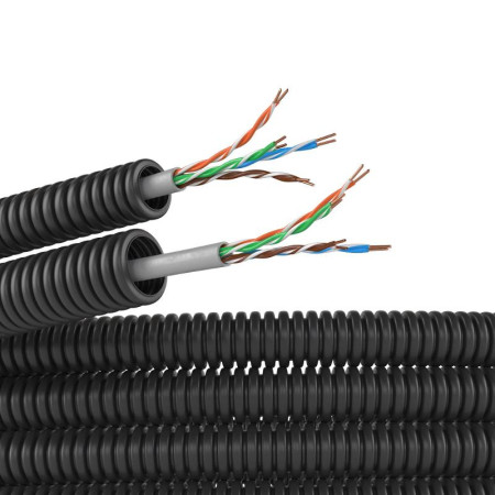 Электротруба ПНД гибкая гофрированная д. 16 мм, цвет черный, с кабелем витая пара 5EU/UTP нг(А)-HF, 100 м