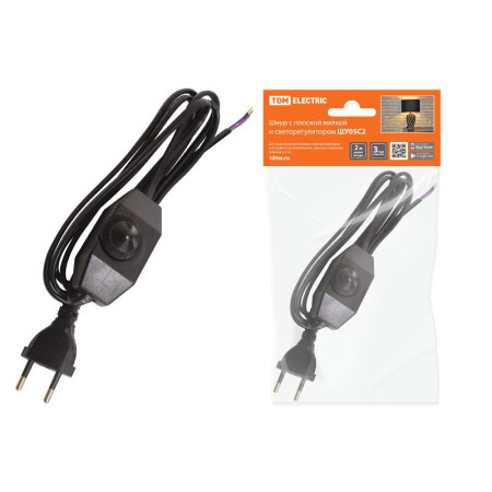 Шнур с плоской вилкой и светорегулятором ШУ05С2 (200Вт, RL) ШВВП 2х0,75мм2 2м. черный